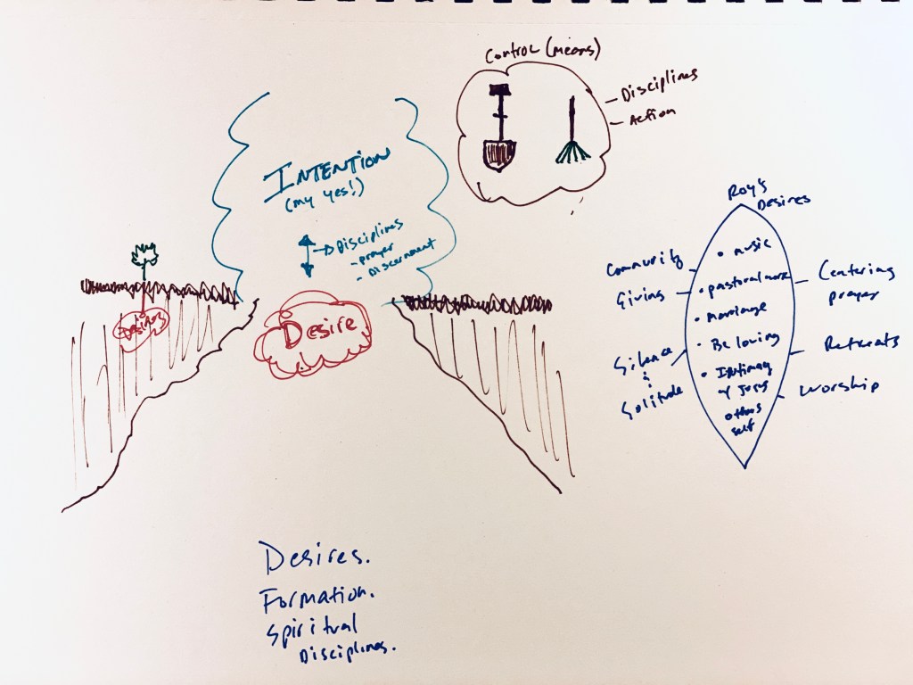 Spiritual disciplines help foster all three movements of this progression. It could be that a discipline helps us to come in contact with our desire. Or that it helps us to keep saying YES to intention and desire. Or the discipline is focused on the action part.